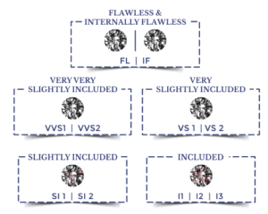 Clarity, too, plays a key role in determining the price of a diamond. For instance, flawless diamonds are rarest in terms of clarity and thus command higher prices. The following table offers a peek into the clarity chart of diamonds: