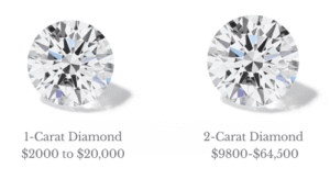 2-Carat Diamond price: The average price of a 2-carat round brilliant cut diamond ranges from $9800-$64,500. This sudden jump in price is due to the increase in price per carat.