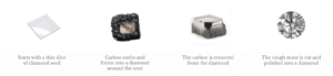 A small diamond seed is placed into the carbon. This seed is processed using either of the 3 processes – belt press, cubic press, and the split sphere (BARS) press. The seeds are exposed to a temperature as high as 1500℃ and pressurised to 1.5 million pounds per square inch. At such an extreme temperature and pressure, the carbon melts to form a diamond. It is then cooled to form a pure diamond.